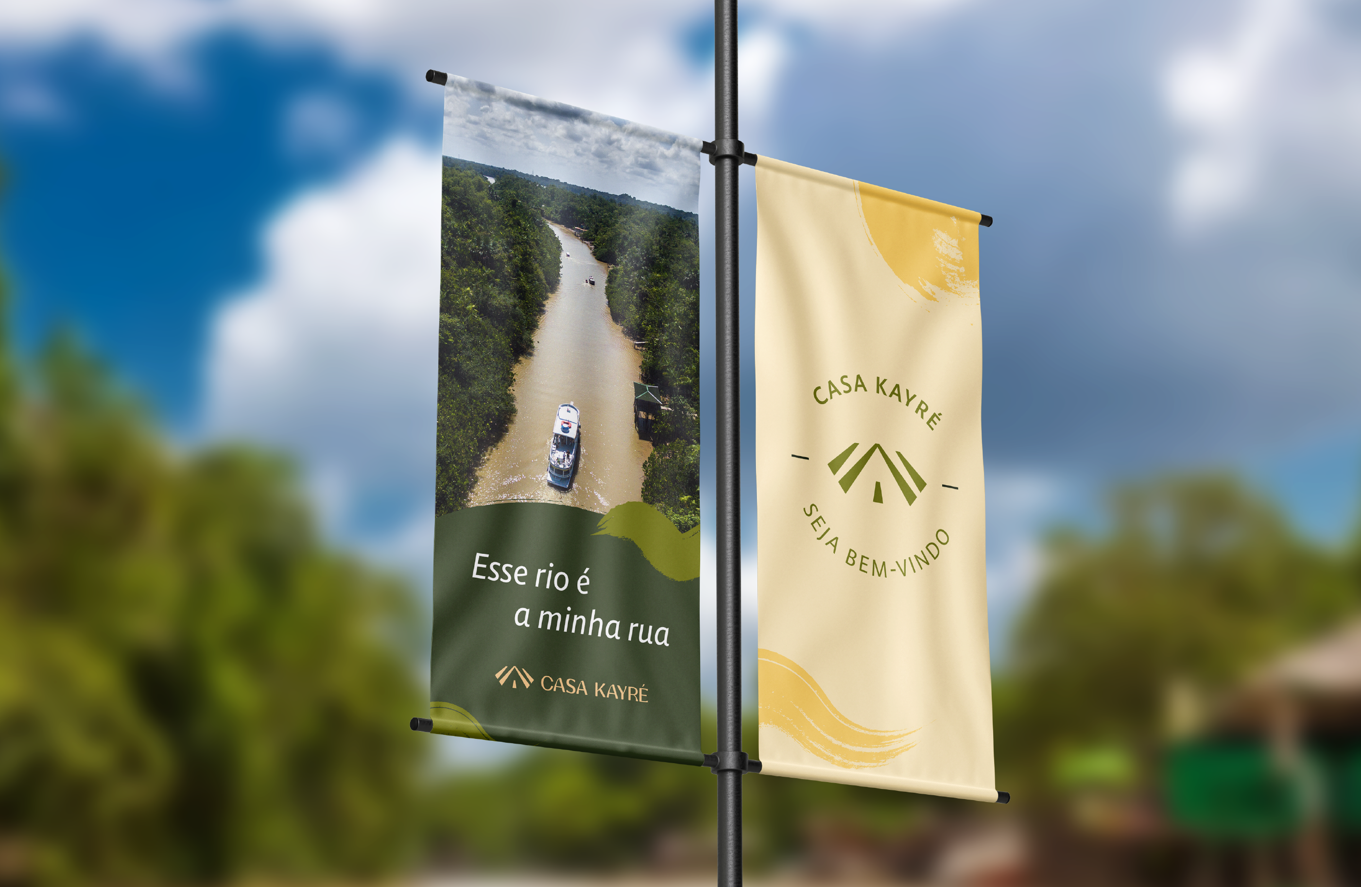 The challenge was to develop the entire brand concept for Casa Kayré, translating its riverside essence into an authentic and engaging visual identity. The project needed to reflect the harmony between culture, nature, and sustainable tourism, valuing Amazonian aesthetics without relying on stereotypes. In addition to the visual identity, it was necessary to create communication materials and signage that would guide and captivate visitors, ensuring an immersive and memorable experience.