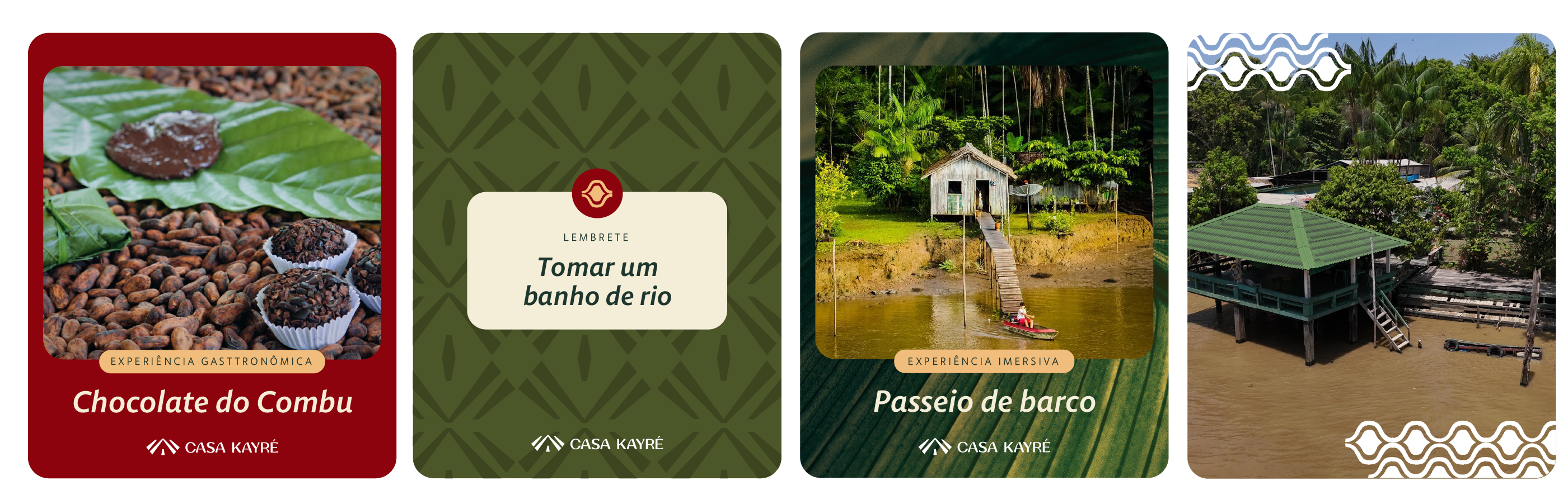 The solution was to create a visual identity that captured the essence of Casa Kayré, balancing tradition and modernity with an organic and welcoming design. The color palette was inspired by the forest, rivers, and Amazonian wildlife, while the graphic elements evoke the movement of the waters and riverside architecture. In addition to the logo, communication materials, signage, and visual experiences were developed to strengthen the visitor’s connection with the local culture. The result is an authentic brand that conveys conscious tourism and the appreciation of Amazonian knowledge in a sophisticated and accessible way.